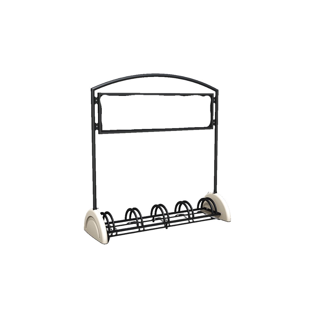 Rastrelliera porta bici per arredo urbano a cinque posti. Struttura composta da due supporti cementizi in CLS di prima scelta, lisci, di colore bianco, trattati con speciale liquido protettivo anti degrado, ancorati con due traverse orizzontali di collegamento in tubo rettangolare e piedini d’appoggio. Cinque staffe ferma-bici, sagomate ad arco in tubo tondo di acciaio zincato a sezione ovale saldate sulle traverse di collegamento. Tabella bifacciale composta da un telaio reggi-tabella ad archetto superiore in tubo tondo di acciaio zincato con piastre di collegamento della tabella. Cornice perimetrale in scatolato di acciaio zincato e pannello per affissioni applicato all'interno. La cornice è ancorata al telaio esterno con piastre di collegamento saldate sui lati corti. Il porta bici a cinque posti viene fornito in kit di assemblaggio con la viteria in acciaio inox e le istruzioni di montaggio. I supporti in cemento sono inoltre dotati di piastre con fori per il fissaggio al terreno mediante tirafondi e tasselli ad espansione