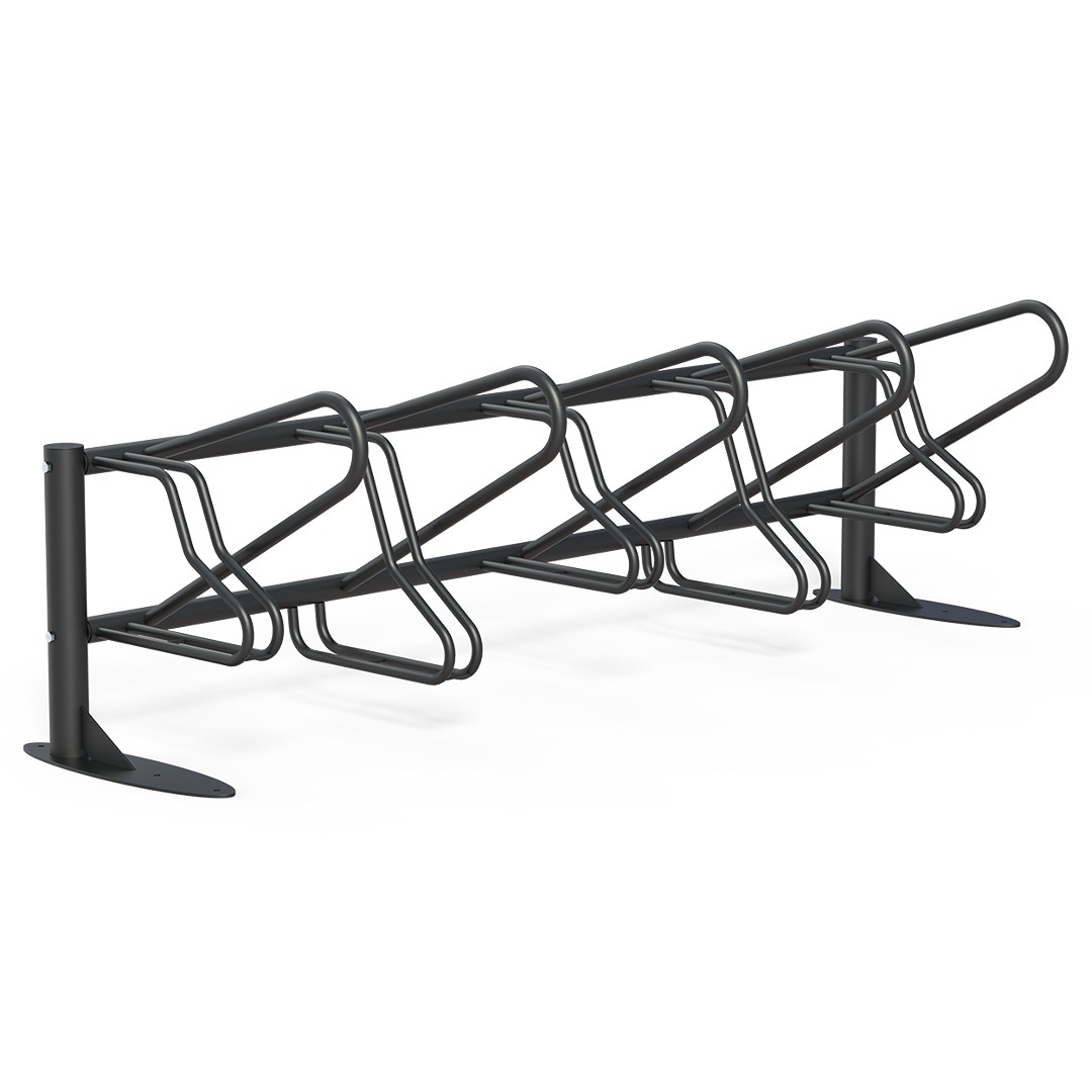 Rastrelliere per biciclette realizzato in acciaio zincato per arredo urbano. Struttura composta da due montanti di sostegno in tubo tondo di acciaio zincato dotati di piastre di base per il fissaggio al suolo, e completi di tappi in PVC. Due traverse orizzontali in tubo tondo di acciaio zincato fungono da anime interne su cui saranno inseriti, a scorrimento, le cinque staffe ferma-bici ed i relativi tubi distanziatori.