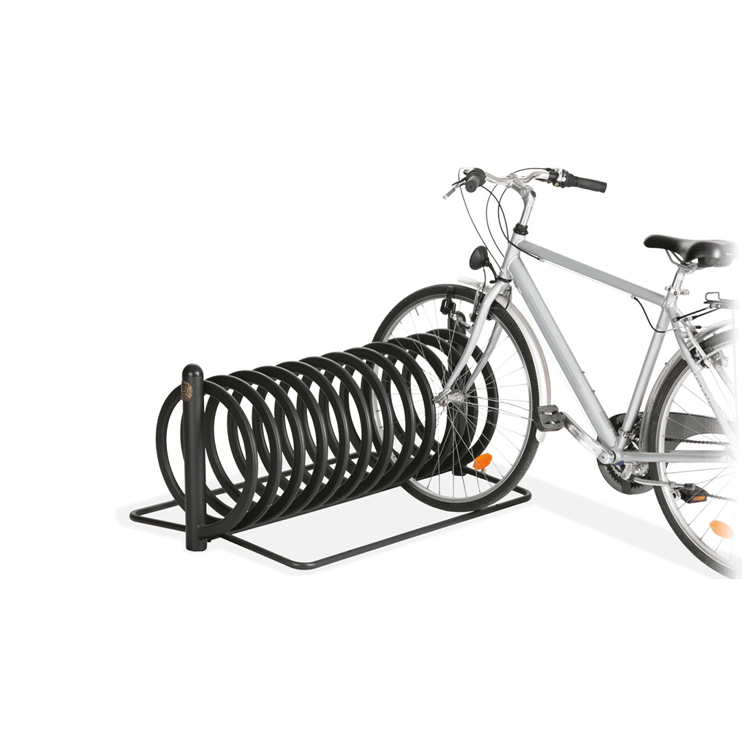 Rastrelliere per biciclette realizzato in acciaio zincato per arredo urbano. Struttura composta da due montanti di sostegno in tubo tondo di acciaio zincato completi di tappi terminali in PVC a testa sferica, traversa orizzontale di collegamento in tubo tondo di acciaio zincato completa di piedini d’appoggio, elemento ferma-bici elicoidale realizzato in tubo a sezione ovale con possibilità di parcheggio da ambo i lati e due elementi ferma-ruota sagomati ad “U” in tubo tondo di acciaio zincato. L’ancoraggio avviene mediante il prolungamento del montante nel sottosuolo. Il porta-bici è fornito in kit di assemblaggio con viteria in acciaio inox ed istruzioni per il montaggio. La finitura base per le parti metalliche di questo prodotto è del colore “canna fucile” caratterizzato da una cromia grigio scuro dall'effetto metallico.