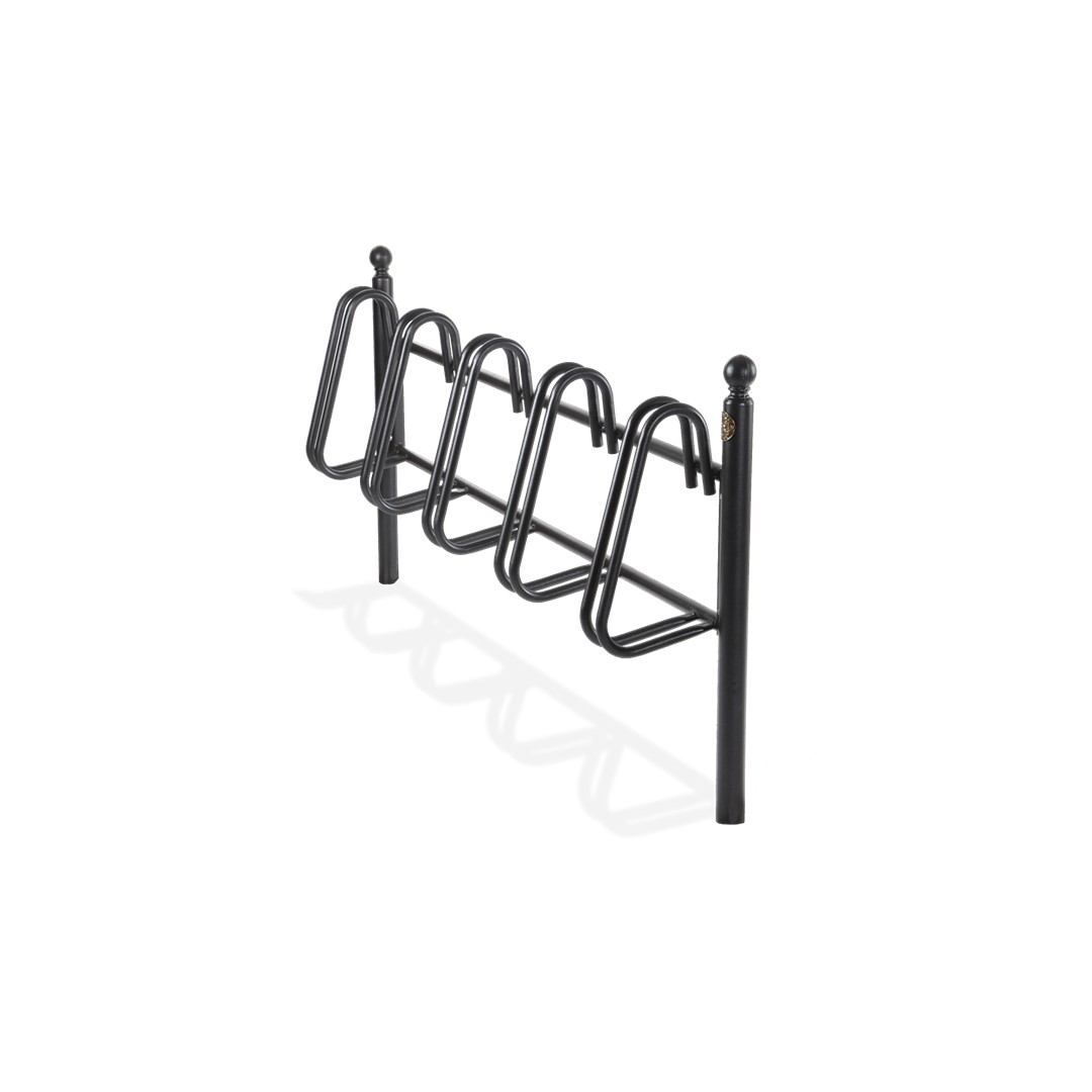Rastrelliera verticale per biciclette a cinque postazioni. Struttura composta da due montanti di sostegno in tubo tondo di acciaio zincato adornati nella parte superiore da fregi decorativi. I montanti di sostegno sono ancorati al terreno tramite il prolungamento degli stessi nel sottosuolo. Due traverse orizzontali di collegamento in tubo tondo di acciaio zincato e cinque staffe ferma-bici in tubo tondo di acciaio zincato. Il porta-bici verticale viene fornito in kit di assemblaggio con viteria in acciaio inox ed istruzioni di montaggio. La finitura base per le parti metalliche di questo prodotto è del colore “canna fucile” caratterizzato da una cromia grigio scuro dall'effetto metallico.