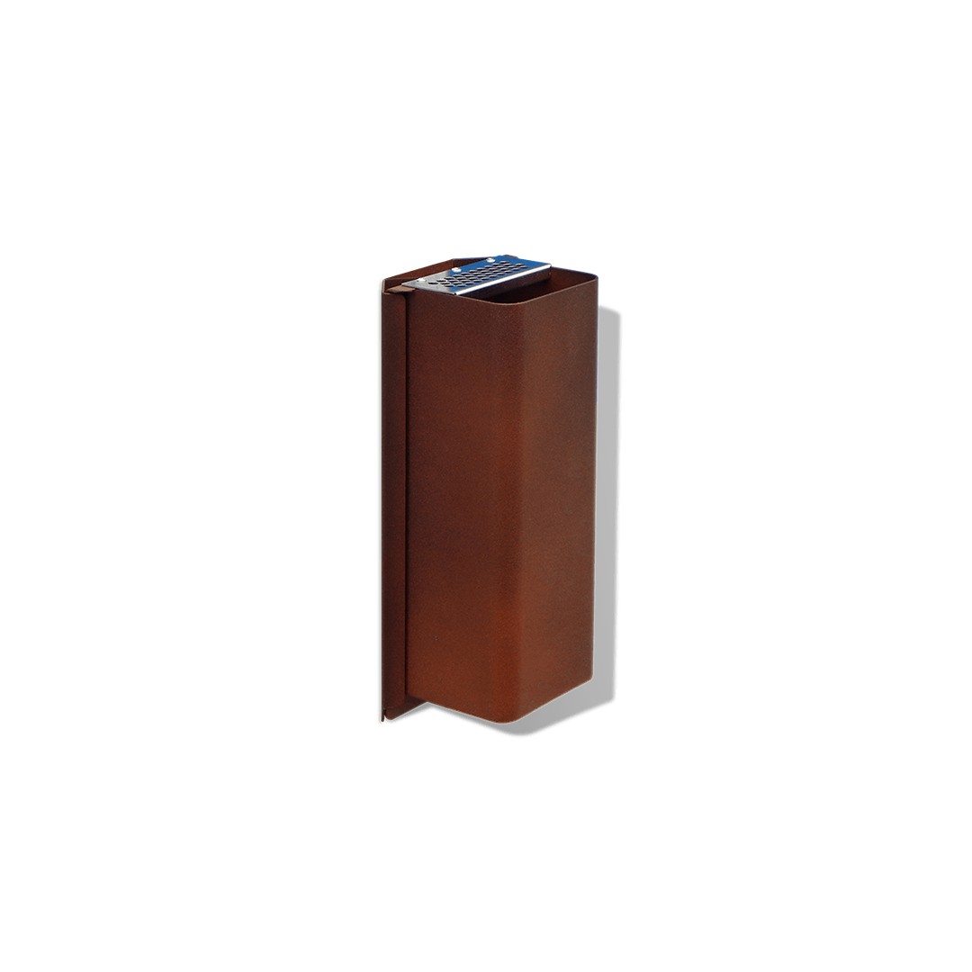 Posacenere con attacco a muro, realizzato in acciaio zincato. Struttura realizzata da uno scatolato posteriore in lamiera zincata con predisposizione per il fissaggio a muro. Contenitore sagomato realizzato in lamiera zincata con bordi arrotondati nella parte frontale, completo di piastra micro-forata per lo spegnimento delle sigarette realizzata in lamiera di acciaio inox AISI 304 lucida; Fondo in lamiera di acciaio zincata con fori per lo scarico delle acque meteoriche. Le operazioni di svuotamento del contenitore sono facilitate dallo sgancio dell’apposita vite a brugola che consente l’estrazione del contenitore. La struttura è dotata di fori per il fissaggio al muro, le viti sono in dotazione.
