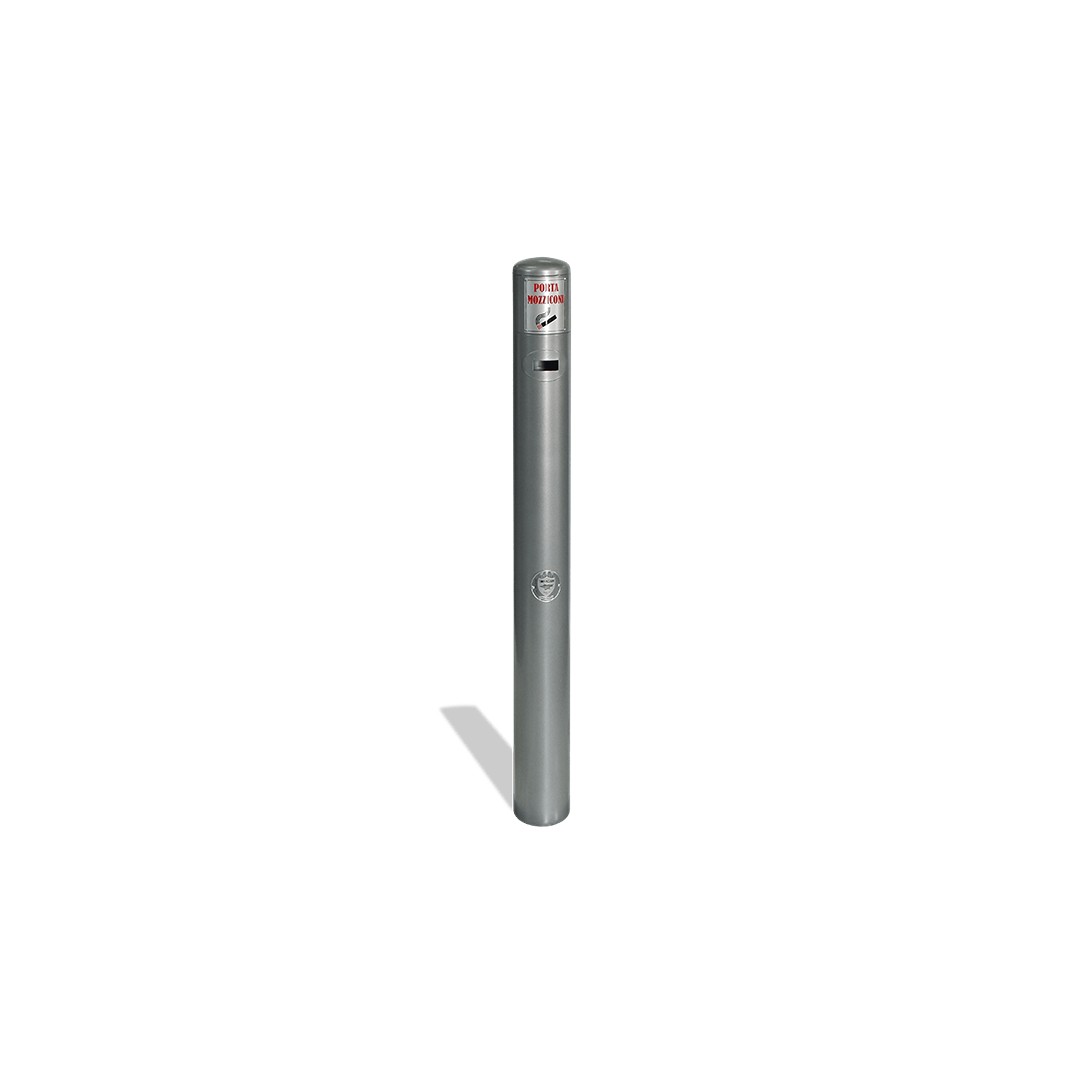 Porta mozziconi in acciaio per arredo urbano. Struttura composta da un fusto in tubo tondo di acciaio zincato provvisto di feritoia per l’introduzione dei mozziconi e di piastra alla base con fori per il fissaggio al terreno. Il fissaggio del porta mozziconi avviene mediante il prolungamento dello stesso nel sottosuolo. Contenitore è di tipo estraibile e l’estrazione avviene mediante lo svitamento dell’apposita vite a brugola. La finitura base per questo prodotto è del colore “alluminio brillante” caratterizzato da una cromia grigio chiara dall'effetto metallico