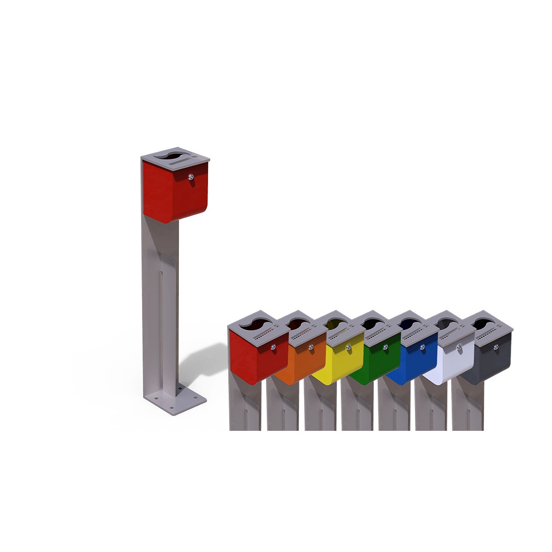 Caratteristiche principali: posacenere urbano, posacenere esterni, posacenere svuotamento, posacenere da terra, posacenere bicolore,posacenere urbano design moderno, posacenere in lamiera d’acciaio per esterni, posacenere con sistema di svuotamento a vite, posacenere da terra con fissaggio a tirafondi, posacenere per arredo urbano bicolore