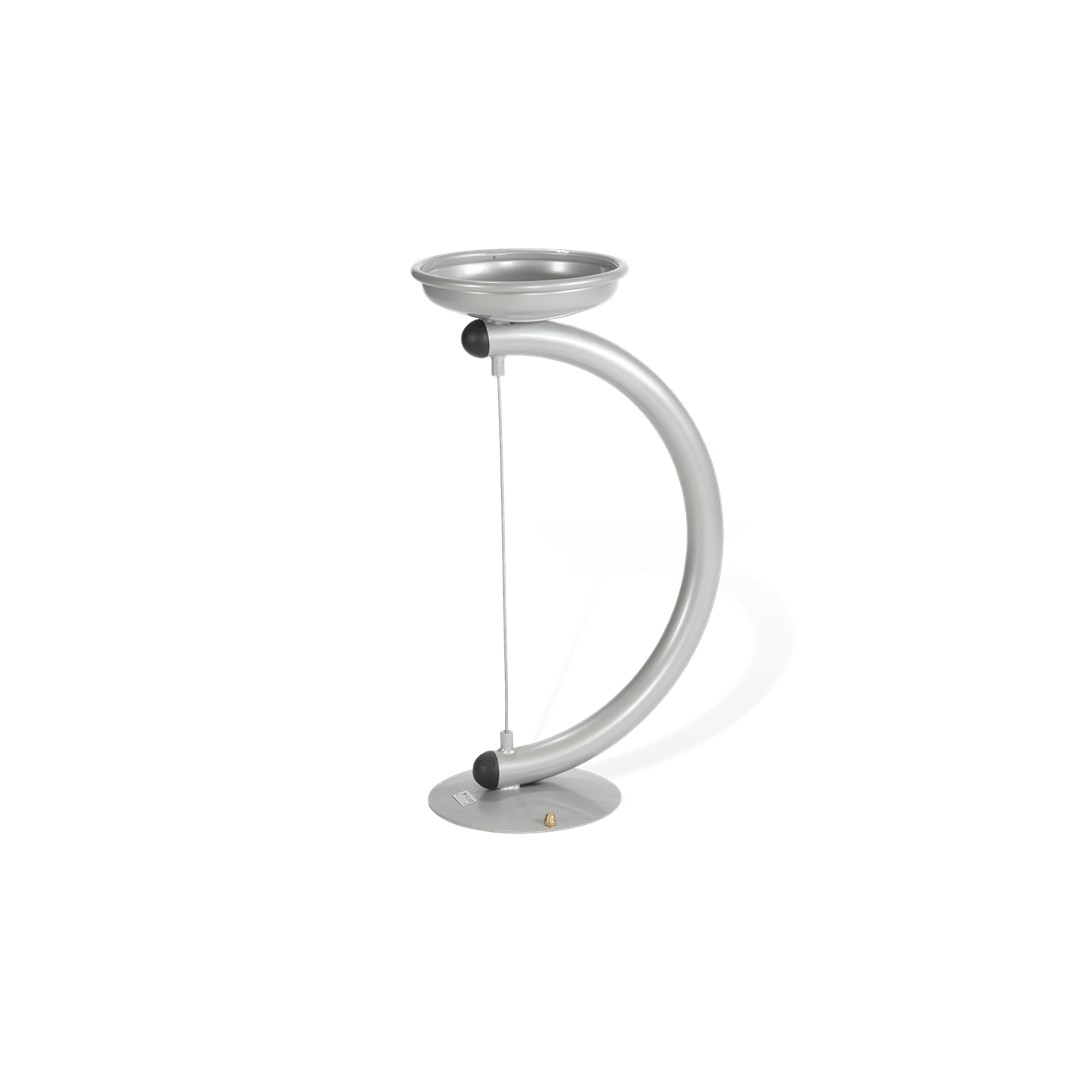 Posacenere in metallo con montante di sostegno curvo, per arredo urbano. Struttura composta da un montante di sostegno ad arco realizzato in tubo tondo di acciaio zincato completo di tappi terminali in PVC a testa sferica e base dotata di piastra con fori per l’ancoraggio al terreno. L’ancoraggio al terreno avviene mediante l’utilizzo di tirafondi e tasselli ad espansione. Contenitore sagomato in lamiera di acciaio zincata spessore con bordatura anti taglio in tubo tondo e cavo decorativo in acciaio. La finitura base per le parti metalliche di questo prodotto è il colore “alluminio brillante” caratterizzato da una cromia grigio chiara dall'effetto metallico.