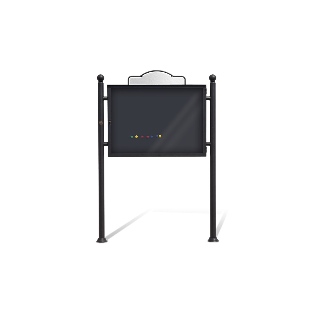 Bacheca per affissioni pubbliche realizzata in acciaio, modello Prestige. Struttura composta da uno scatolato di acciaio zincato completa di gocciolatoio nella parte superiore. Anta anteriore apribile realizzata in profilati di acciaio zincato e munita di chiusura a chiave con lato di lettura realizzato in policarbonato compatto trasparente, infrangibile, protetto ai raggi UV e particolarmente adatto per l’esterno. Targhetta (smontabile), nella parte superiore, per apporre l’eventuale denominazione del Comune. Affissione mediante magneti. Montanti di sostegno in tubo tondo di acciaio zincato adornati nella parte superiore da fregi decorativi e da due flange decorative a copertura dei fori praticati per l’ancoraggio al terreno. L’ancoraggio al terreno avviene mediante il prolungamento dei montanti nel sottosuolo. La finitura base per le parti metalliche di questo prodotto è del colore “canna fucile” caratterizzato da una cromia grigio scuro dall'effetto metallico. Il cliente può comunque richiedere una finitura differente, a scelta tra i colori RAL a disposizione sul nostro sito web. La tecnica di verniciatura adottata per la struttura in acciaio zincato è a polveri termoindurenti con cottura a forno. Per tutti i dettagli vi invitiamo a scaricare la scheda tecnica dettagliata sul prodotto.
