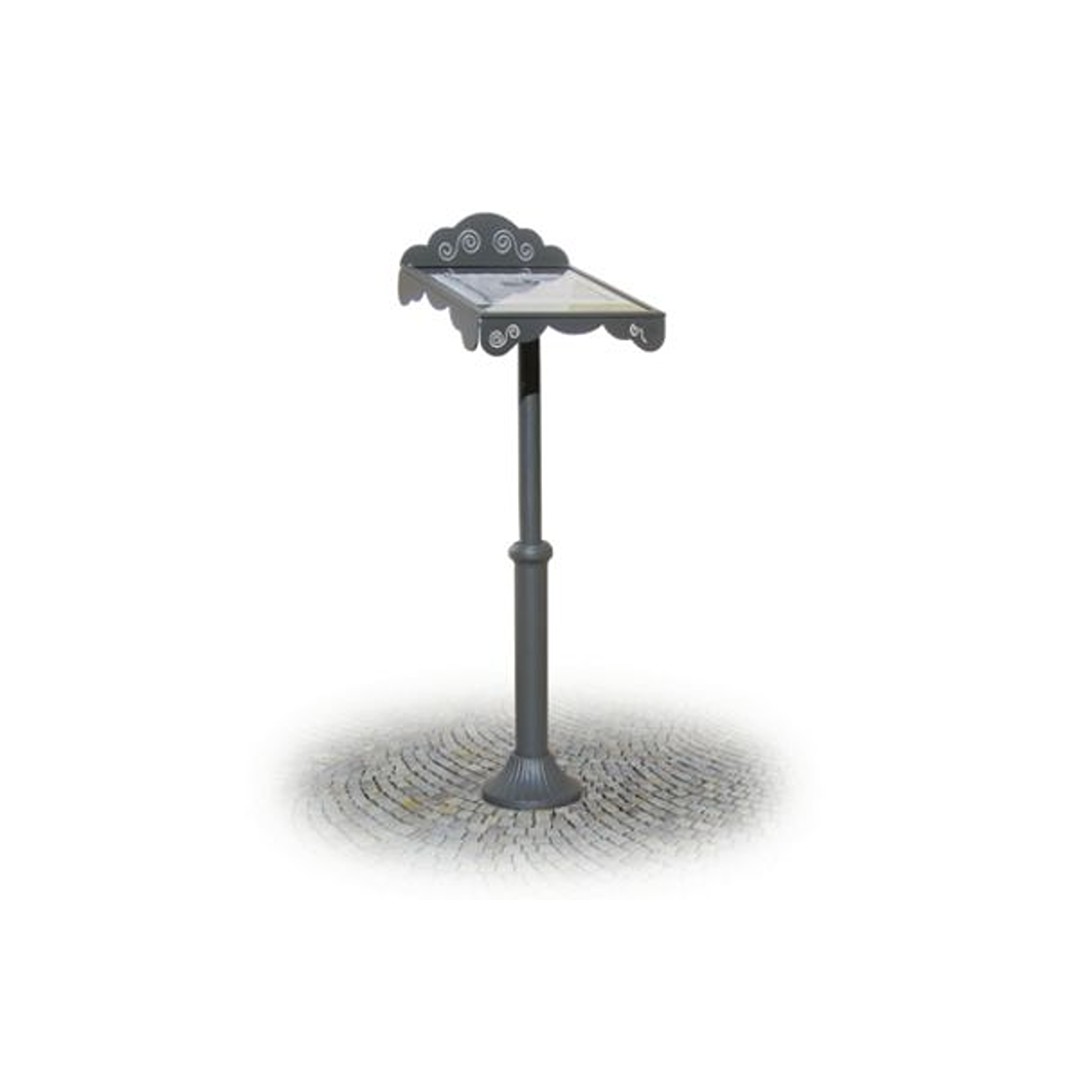 Supporto verticale realizzato in tubo tondo d'acciaio zincato diametro mm. 60 per la parte inferiore e diametro mm. 40 per la parte superiore. Tabella per affissione in lamiera d'acciaio zincato, sagomata con tecnologia laser, dotata di lastra in plexiglass trasparente. Dimensioni tabella cm 35 x 35. Dotato di flangia copriforo in fusione di alluminio. Ingombro: cm 35 x35 x 120 h - altezza utile cm 100 ca. Ancoraggio: da interrare.