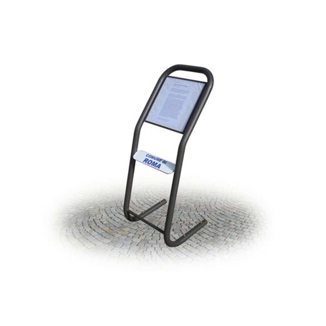 Leggio realizzato in tubo tondo d'acciaio zincato diametro mm. 40 x 1,5. Lamiera per affissione informazioni in lamiera d'acciaio zincato sp. 20/10 dotata di lastra in plexiglass trasparente. Dimensioni tabella cm 40x40. Ancoraggio: filo pavimento. Ingombro: cm 48 x 100 h.