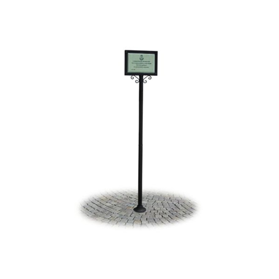 Palina realizzata in tubolare d’acciaio zincato mm. 20×20 e lamiera d’acciaio zincato spessore 20/10. Palo di sostegno realizzato in tubo tondo diametro 60 x 2 e tubo tondo diametro 50 x 2. Dimensioni tabella cm 40 x 25 h.