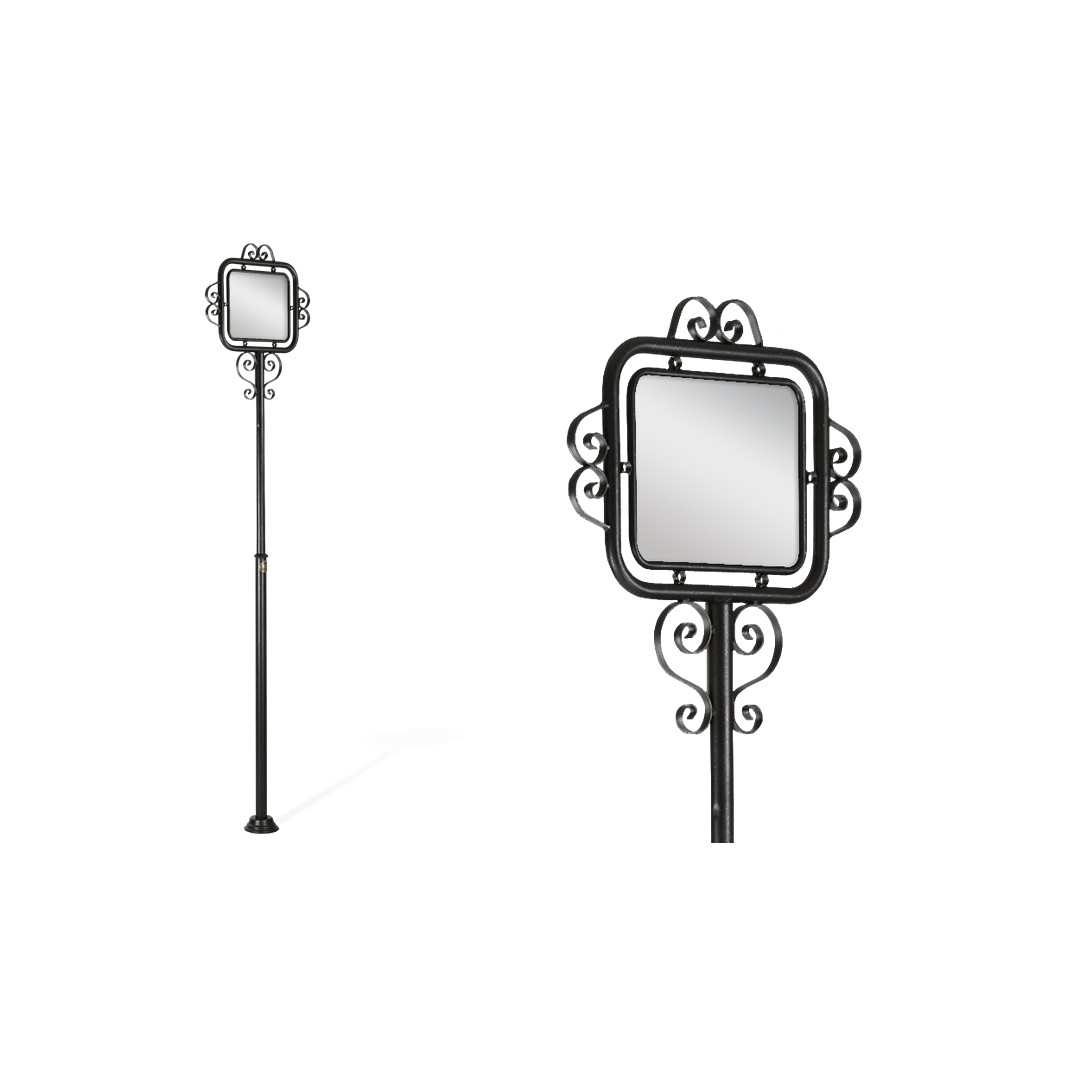 Tabella bi-facciale per segnaletica stradale, design classico. Struttura composta da cornice perimetrale esterna in tubo tondo di acciaio zincato, cornice reggi-targhetta in tubo tondo di acciaio, targhetta (smontabile), per apporre l’eventuale denominazione del luogo, in lamiera zincata, decorazioni ornamentali in ferro piatto zincato. Montante di sostegno in tubo tondo di acciaio zincato con elemento intermedio decorativo di riduzione, flangia decorativa a copertura del foro praticato per l’ancoraggio al terreno. L’ancoraggio avviene mediante il prolungamento del montante nel sottosuolo. La finitura base per le parti metalliche di questo prodotto è del colore “canna fucile” caratterizzato da una cromia grigio scuro dall'effetto metallico. Il cliente può comunque richiedere una finitura differente, a scelta tra i colori RAL a disposizione. Dimensioni 70 x 17 x 248 h cm -Peso 14 kg
