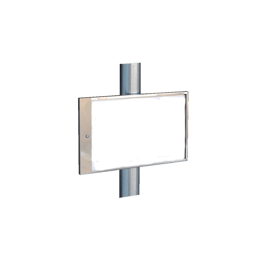 Tabella porta-orari in acciaio inox mono facciale. Struttura di forma rettangolare realizzata in lamiera di acciaio inox AISI 304 lucida, con graffa laterale (dotata di vite) per il bloccaggio sicuro del foglio informativo. La tabella è provvista, nella parte posteriore, di una staffa composta da due metà (di cui una fissa al corpo della tabella) predisposta per ospitare, internamente, un montante a sezione circolare, sarà a cura del Cliente specificare le dimensioni del montante. La tabella è predisposta per ospitare sia l’eventuale foglio orari (in formato A4 - orizzontale) che il rispettivo pannello in policarbonato compatto trasparentee, tale pannello, proteggerà le informazioni ed eviterà la rimozione accidentale o non autorizzata. La struttura di questo articolo è interamente in acciaio inox, il fissaggio avviene mediante l'accoppiamento della staffa sul montante esistente. La tabella è fornita in kit di assemblaggio e viteria in acciaio inox. La sostituzione dei fogli orari avviene mediante sgancio della vite, rimozione della graffa ed estrazione laterale. Dimensioni 31 x 10 x 25 h cm
