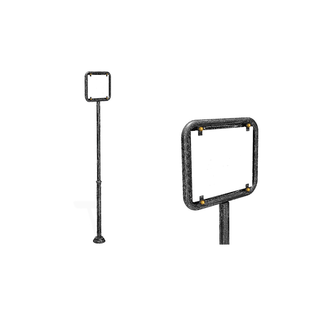 Struttura composta da cornice perimetrale in tubo tondo di acciaio zincato, pannello interno in lamiera zincata. Montante di sostegno in tubo tondo di acciaio zincato con elemento intermedio decorativo di riduzione. Flangia decorativa a copertura del foro praticato per l’ancoraggio al terreno.