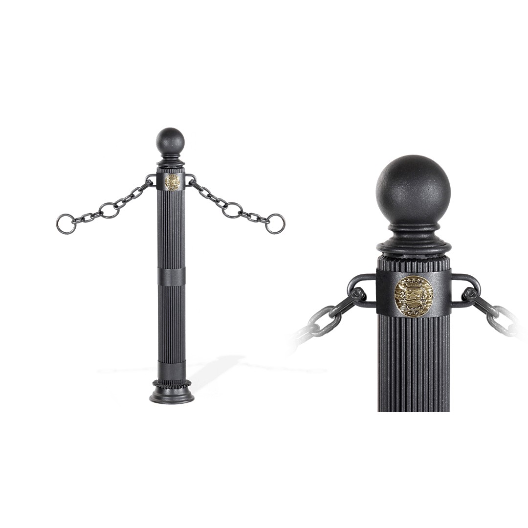 Paletto dissuasore per spazi pubblici con anelli di giunzione a catena. Struttura composta da un tubo tondo di acciaio zincato rivestito da trentasette bacchette decorative in tondo pieno zincato con estremità inferiore sagomata e adornato nella parte superiore da un fregio decorativo, mentre tre fascette decorative avvolgono la parte superiore, inferiore e centrale.