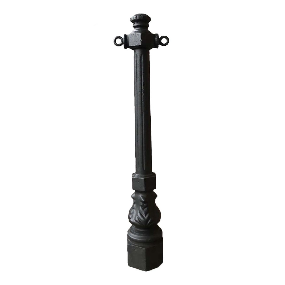 Ornato con foglie alla base e nervature sulla colonna. Fusione unica con zoccolo fungente da zanca per il fissaggio. Collegamento tramite catena con due occhielli posti sulla sommità.