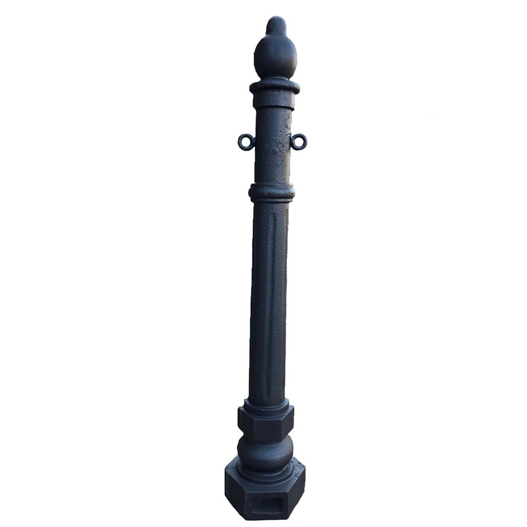 Dissuasore in ghisa sferoidale dal design classico con estremità a goccia e colonnina decorata con nervature all’interno. Base esagonale appositamente studiata per il fissaggio a terra. Altezza in mm: 1050 Larghezza in mm: 150 Diametro in mm: 150