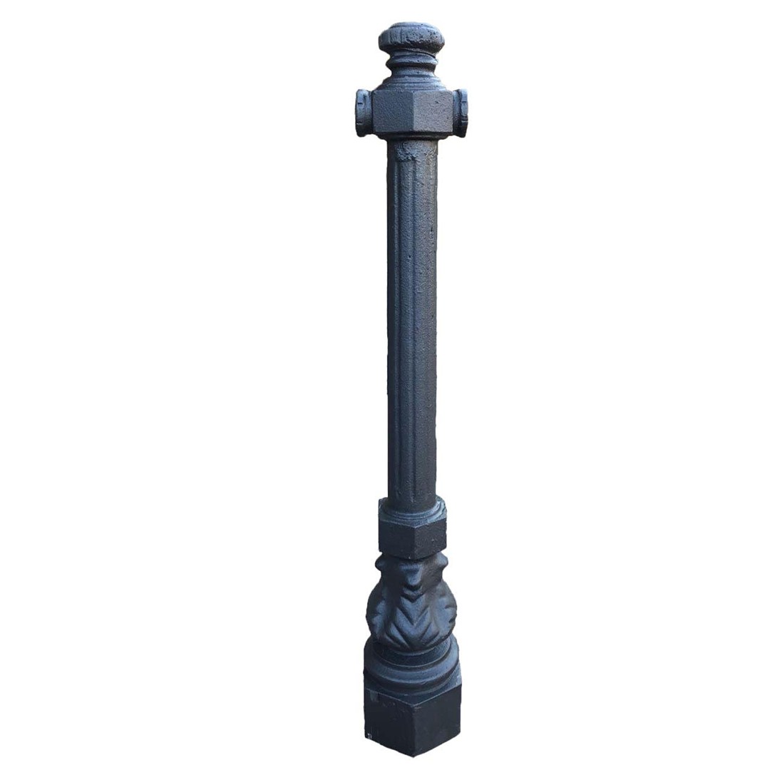 Ornato con foglie alla base e nervature sulla colonna. Fusione unica con zoccolo fungente da zanca per il fissaggio. Collegamento tramite catena.