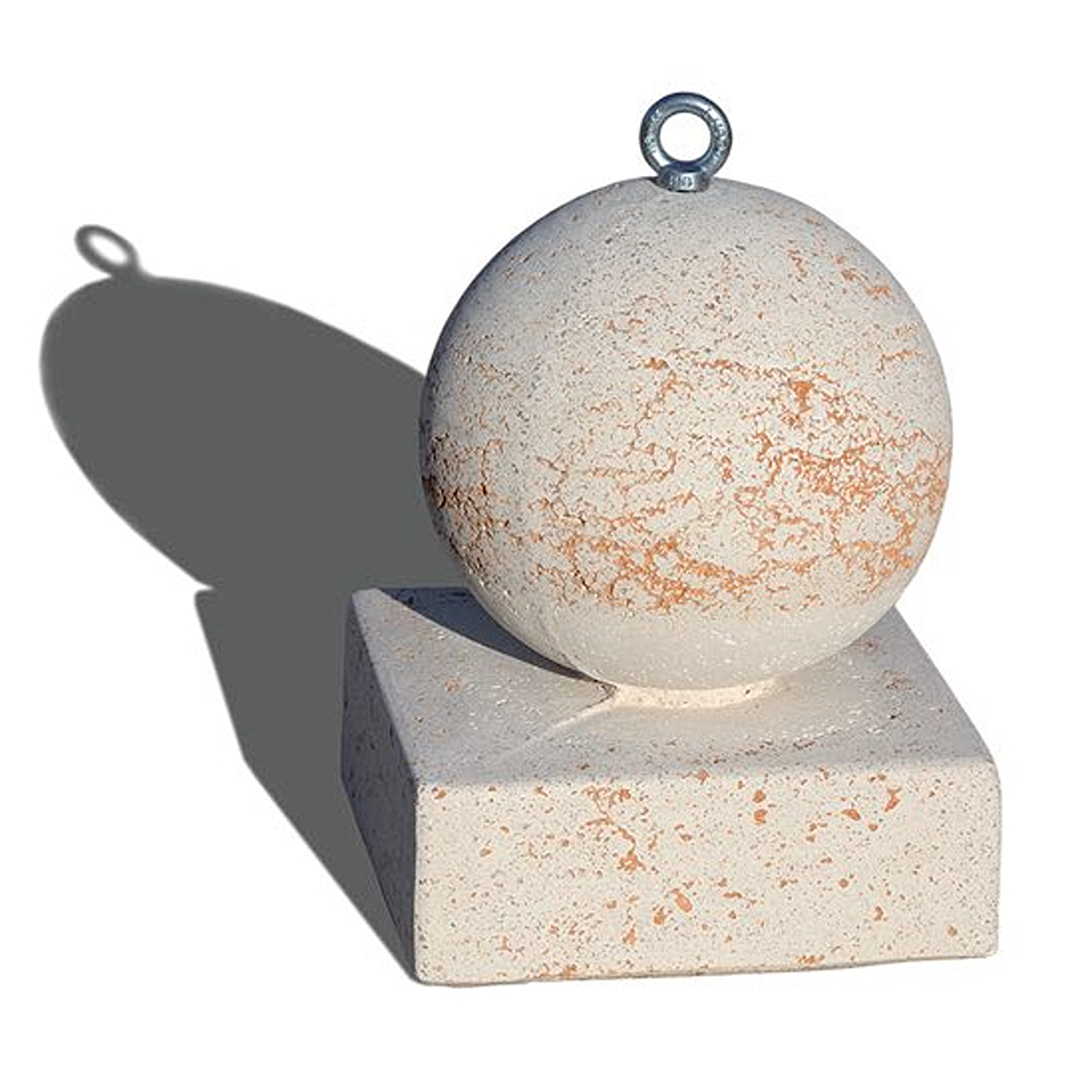 Dissuasore stradale realizzato in calcestruzzo bianco effetto pietra, armato, vibrato e levigato, trattato con del materiale idrorepellente per l’uso esterno, fornito di golfare zincato per facilitarne la movimentazione e per l’applicazione di un eventuale catena.