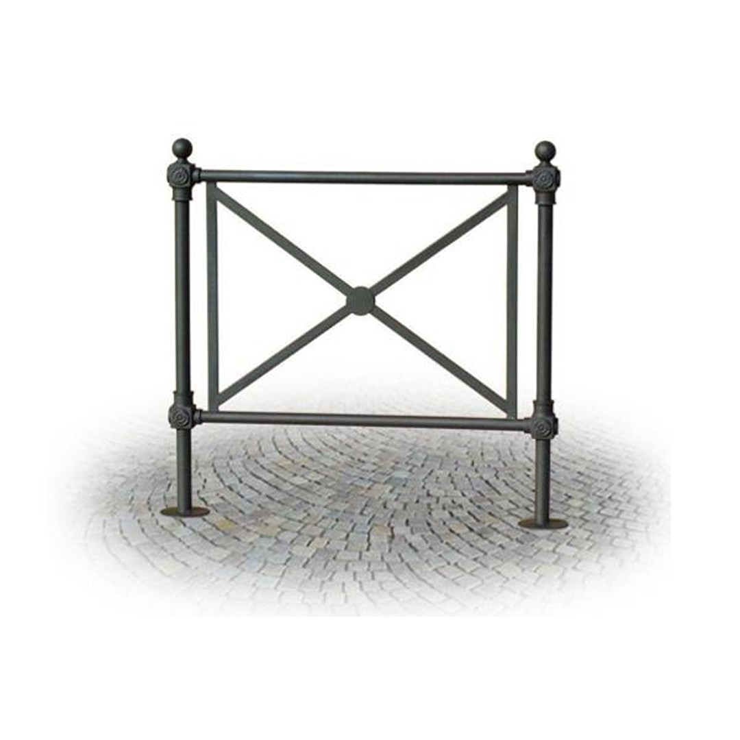Transenna composta da n. 2 montanti in acciaio zincato diametro 42 e correnti orizzontali diametro 33. Elementi di giunzione in fusione d'alluminio. Crociera interna in tubolare d'acciaio zincato con disco centrale decorativo in lamiera. Disponibile nella versione flangiata. Ingombro Vers. flangiata: cm 100 x 100 h. Ingombro Vers. da inghisare: cm 100 x 120 h altezza utile cm 100 ca. Ancoraggio: filo al terreno o da interrare a seconda della versione. Gia' montato.