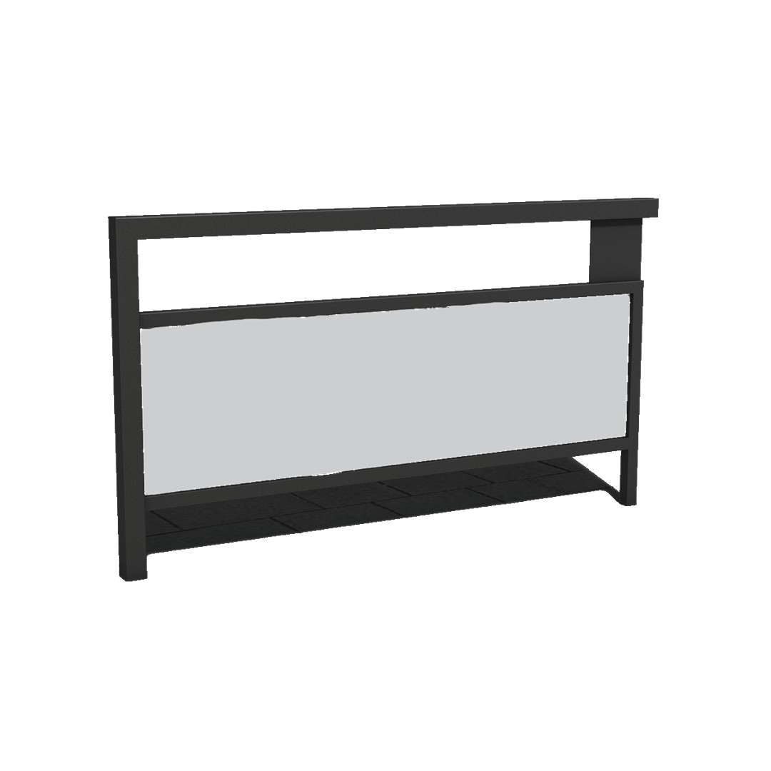 Transenna in acciaio con spazio per affissioni. Struttura composta da un montante e traversa superiore in tubo quadro di acciaio zincato, un montante e telaio interno in tubo quadro a sezione ridotta, pannello pubblicitario interno bifacciale in lamiera di acciaio zincata e piastra di collegamento di forma quadra in acciaio zincato. La transenna è ancorata al terreno mediante il prolungamento dei montanti nel sottosuolo. La finitura base per le parti metalliche di questo prodotto è del colore “canna fucile” caratterizzato da una cromia grigio scuro dall'effetto metallico. Il cliente può comunque richiedere una finitura differente, a scelta tra i colori RAL a disposizione