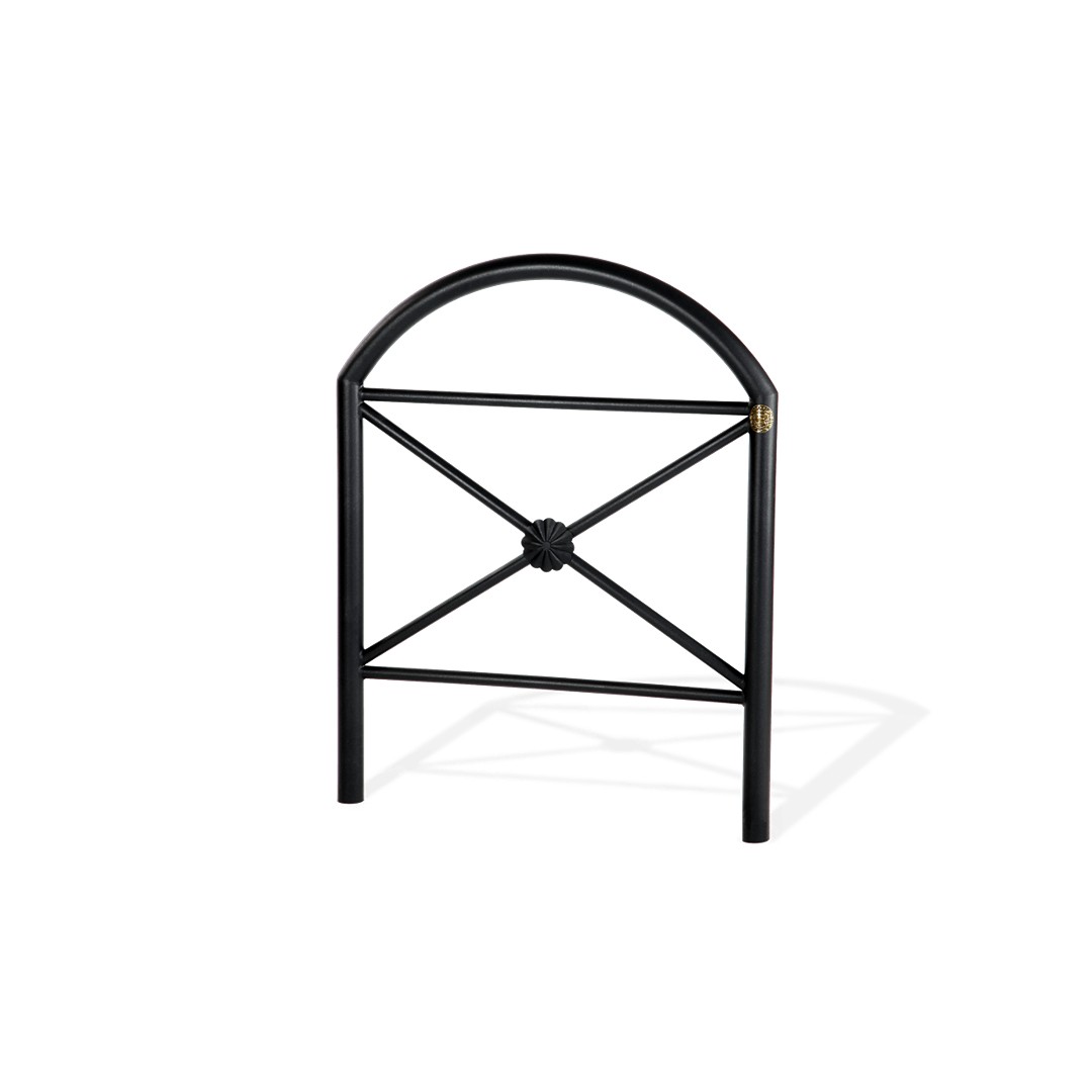 Transenna in metallo para pedone per la delimitazione di spazi pubblici. Struttura composta da montanti di sostegno ed archetto superiore in tubo tondo di acciaio zincato, traverse orizzontali di collegamento e crociera interna in tubo tondo di acciaio zincato adornata da un elemento decorativo centrale. La transenna è ancorata al terreno mediante il prolungamento dei montanti nel sottosuolo. La finitura base per le parti metalliche di questo prodotto è del colore “canna fucile” caratterizzato da una cromia grigio scuro dall'effetto metallico. Il cliente può comunque richiedere una finitura differente, a scelta tra i colori RAL a disposizione