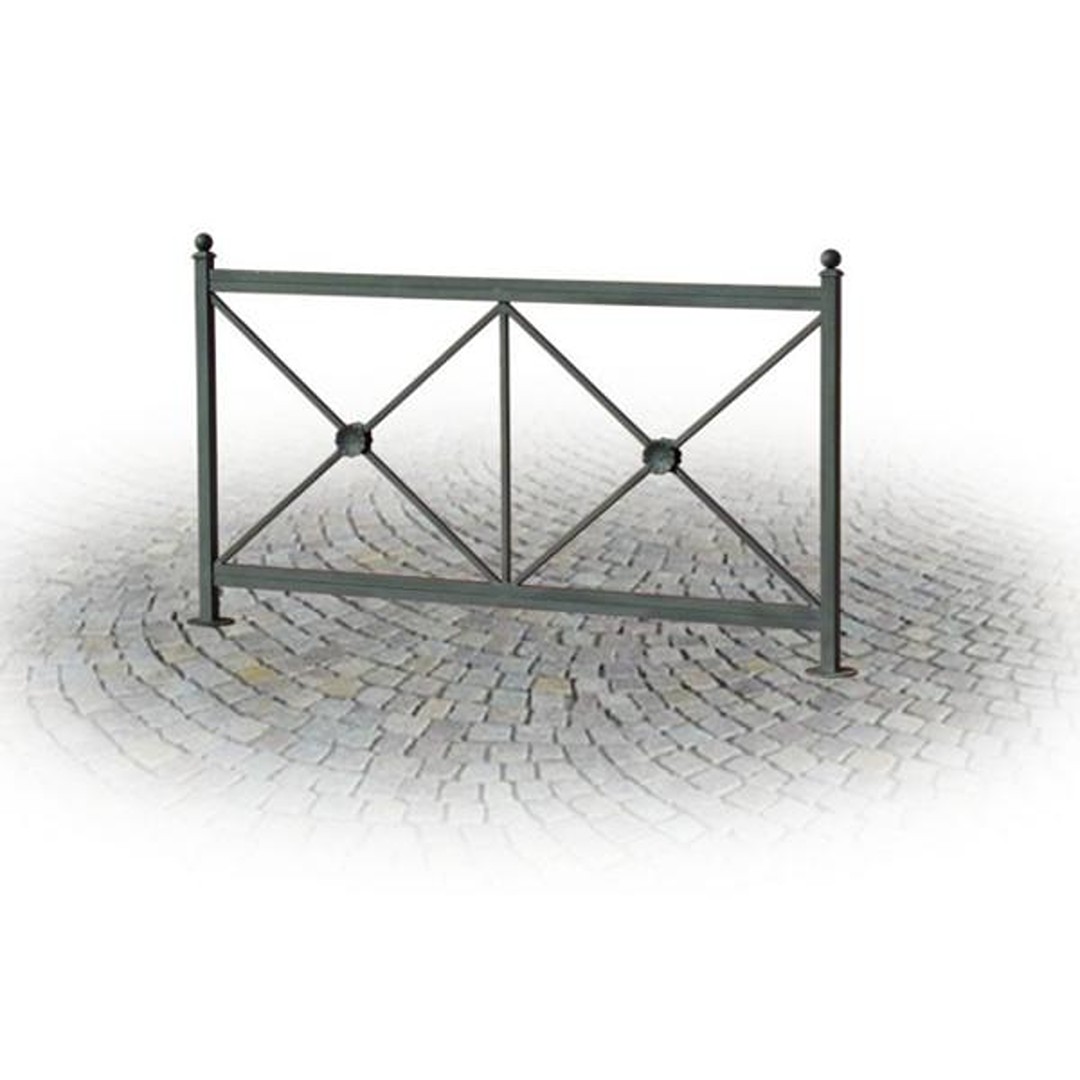 Transenna composta da n. 2 montanti in tubolare d’acciaio zincato mm. 40 x 40 con elemento decorativo posto all’apice in fusione. Doppia crociera realizzata in tubolare d’acciaio zincato con al centro elemento decorativo in acciaio forgiato.
