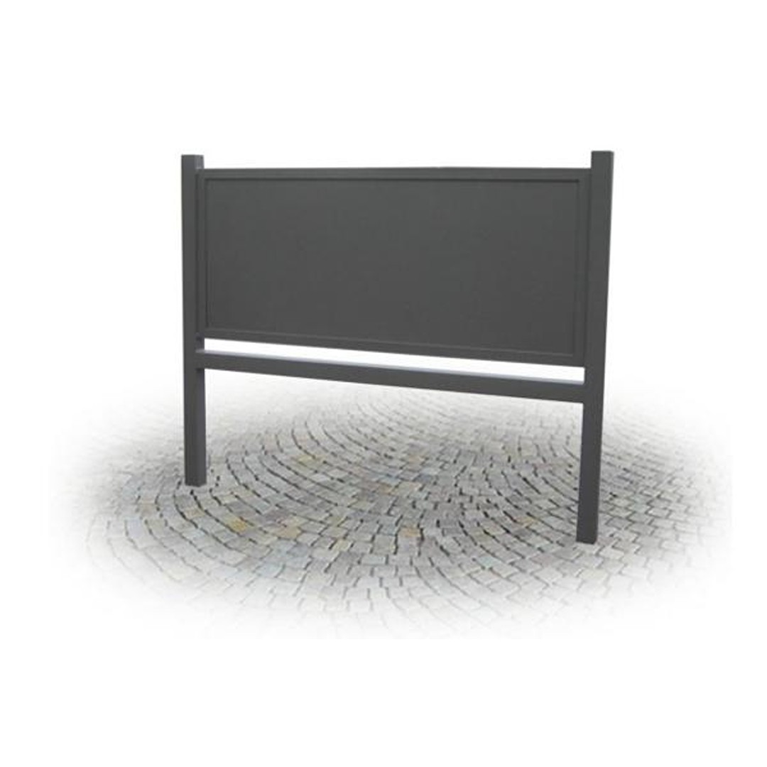 Montanti e traversa realizzati in tubolare d'acciaio zincato quadrato. Telaio interno in tubolare d'acciaio zincato con predisposizione per inserimento pannello in metacrilato compatto mm. 4 o in alternativa lamiera 12/10 zincata. Ingombro: cm 150 x 120 h - altezza utile cm 100. Ancoraggio: da interrare. Già montato.