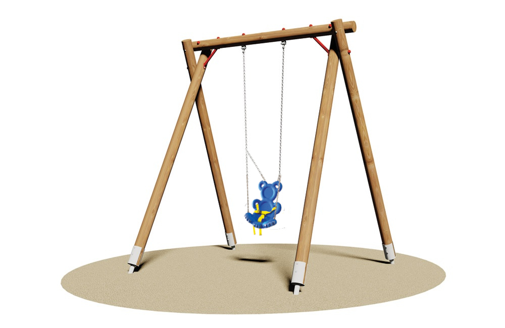 Altalena in legno 1 posto. Realizzata in legno di pino nordico impregnato in autoclave con sali atossici. Struttura costituita da una trave superiore in legno con cuore e quattro montanti obliqui in legno fuori cuore della sezione circolare Ø 120 mm. Trave e montanti sono collegati tra loro da un attacco in tubolare di acciaio zincato. Sono previsti n°1 sedile a orsetto e catene a maglia stretta saldate e zincate a fuoco. Assemblaggio mediante bulloneria in acciaio zincato 8.8 e dadi autobloccanti. Attacchi in metallo zincato a caldo, per l’ancoraggio al suolo. Dimensione 250x240x275h cm. Certificato in conformità delle Norme Europee EN 1176 dall’Istituto Tedesco TÜV - SÜD.