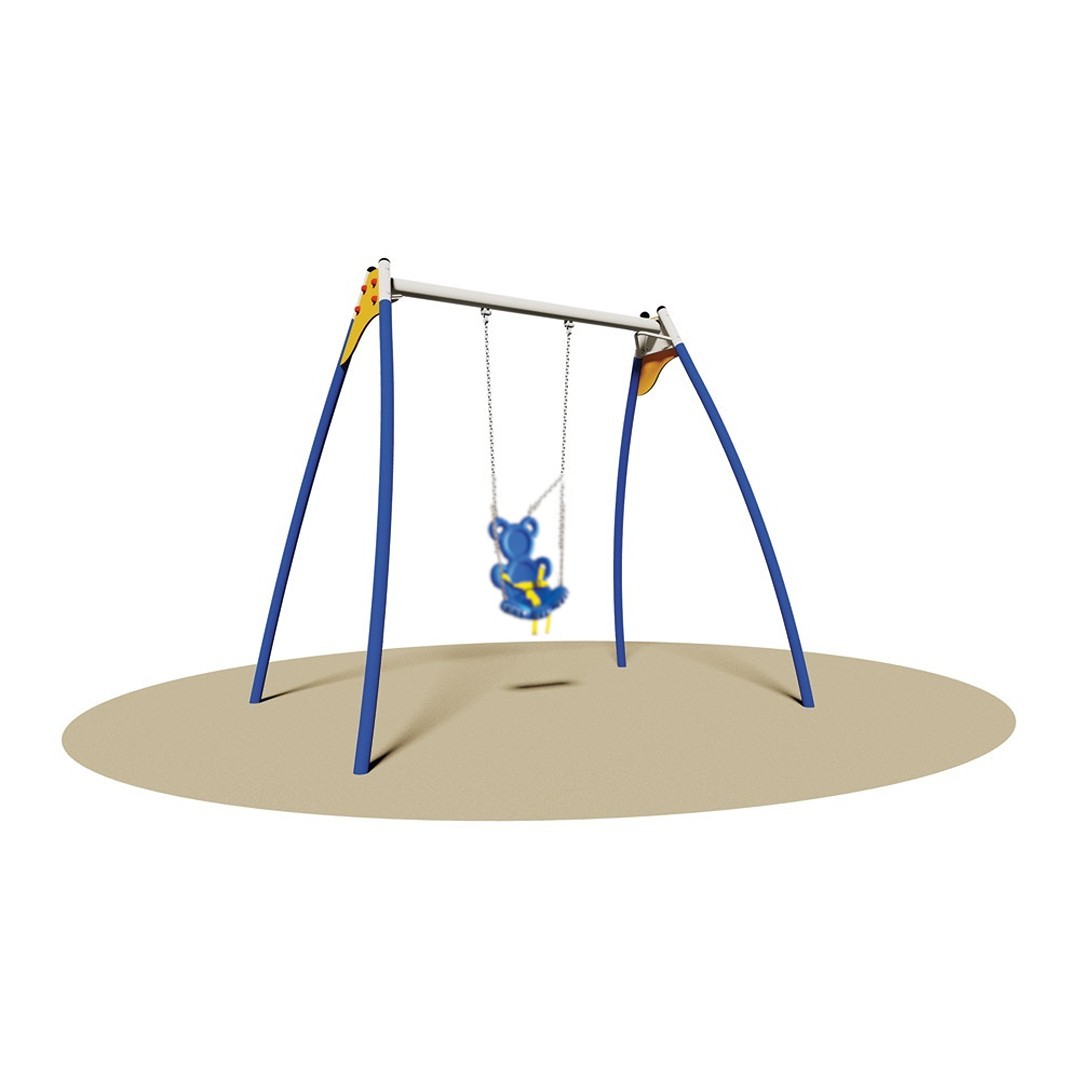 Altalena in metallo a 1 posto realizzata con struttura in tubo tondo di acciaio elettrozincato e verniciato a forno 180°C. Costituita da una trave orizzontale Ø 8,9 cm e n° 4 montanti obliqui e sagomati Ø 6 cm collegati tramite opportuni attacchi saldati alla traversa. N° 1 sedile orsetto. Assemblaggio mediante bulloneria in acciaio zincato 8.8 e dadi autobloccanti. Elementi copridado a norma in nylon colorato. Certificato in conformità delle Norme Europee EN 1176 dall’Istituto Tedesco TÜV - SÜD. Dimensione cm 255x180x230 h