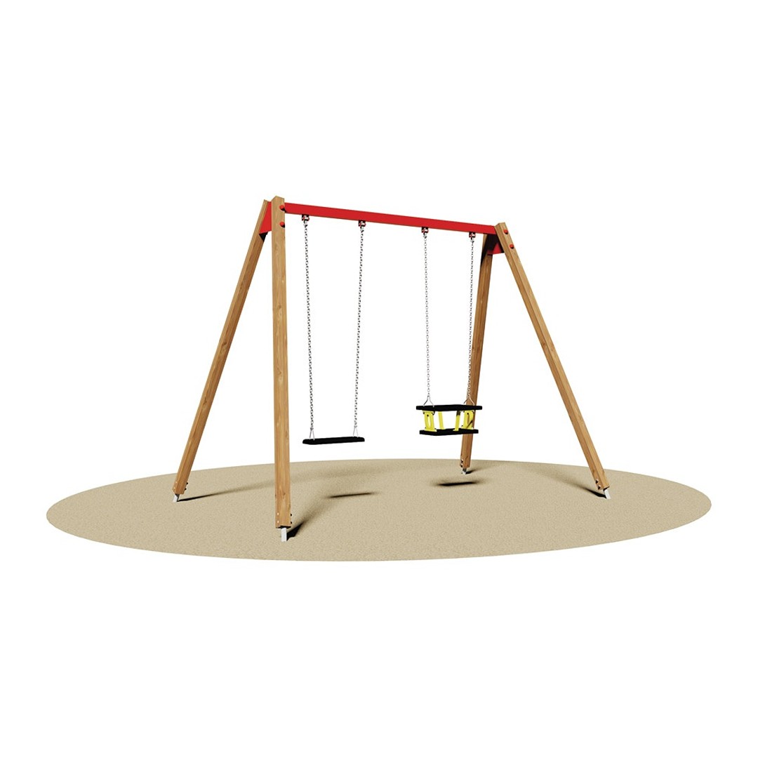 Altalena a 2 posti realizzata con struttura mista di legno lamellare di pino nordico impregnato in autoclave con sali atossici e acciaio zincato e verniciato. Costituito da n°4 montanti in legno lamellare di sez. cm 7x7, una trave in tubolare di acciaio zincato a sez. rettangolare di cm 4x8 verniciata a forno a 180°. Sono previsti n°1 sedili a gabbia in gomma antiurto con anima interna in profilato di alluminio e catene a maglia stretta saldate e zincate a fuoco e n°1 sedile a orsetto. Assemblaggio mediante bulloneria in acciaio zincato 8.8 e dadi autobloccanti. Attacchi in metallo zincato a caldo, per l’ancoraggio al suolo. Certificato in conformità delle Norme Europee EN 1176 dall’Istituto Tedesco TÜV - SÜD. Dimensione cm 300x190x230h