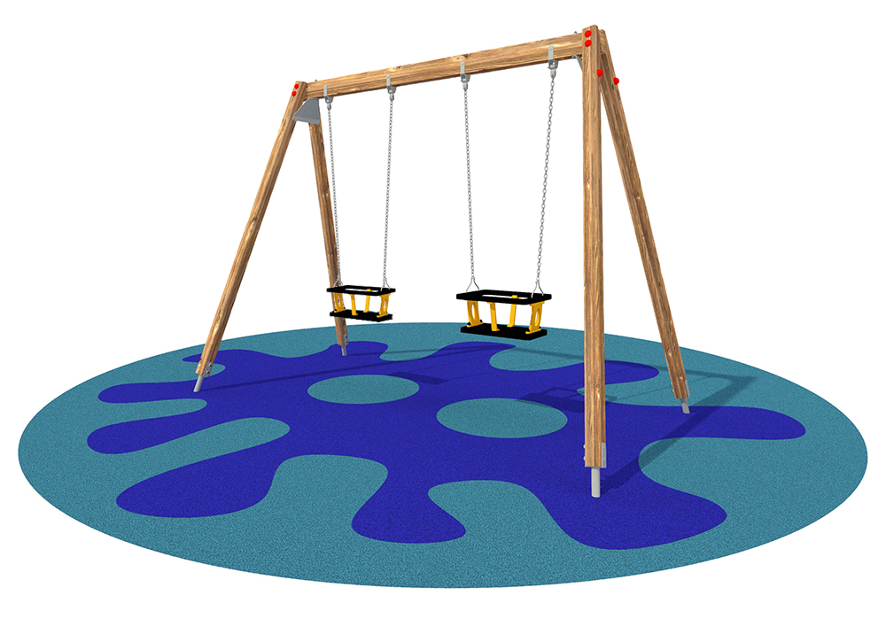 Costituito da n° 4 montanti in legno lamellare di sez. mm 70 x 70 e trave a sez. rettangolare da mm 110 x 60. N° 1 sedile piano in gomma antiurto con anima interna in profilato di alluminio e catene a maglia stretta saldate e zincate a fuoco. N°2 supporti in acciaio inox tra i montanti e la trave.