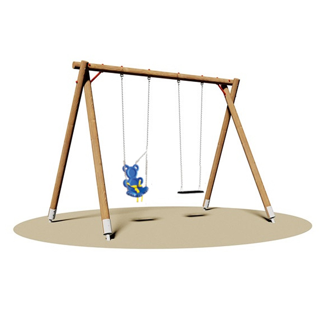 Altalena inclusiva in legno a 2 posti. Realizzata in legno di pino nordico impregnato in autoclave con sali atossici. Struttura costituita da una trave superiore in legno con cuore e quattro montanti obliqui in legno fuori cuore della sezione circolare Ø 120 mm. Trave e montanti sono collegati tra loro da un attacco in tubolare di acciaio zincato. Sono previsti n°1 sedile a orsetto e n°1 sedile a tavoletta e catene a maglia stretta saldate e zincate a fuoco. Assemblaggio mediante bulloneria in acciaio zincato 8.8 e dadi autobloccanti. Attacchi in metallo zincato a caldo, per l’ancoraggio al suolo. Dimensione 365x240x275 h cm. Certificato in conformità delle Norme Europee EN 1176 dall’Istituto Tedesco TÜV - SÜD.