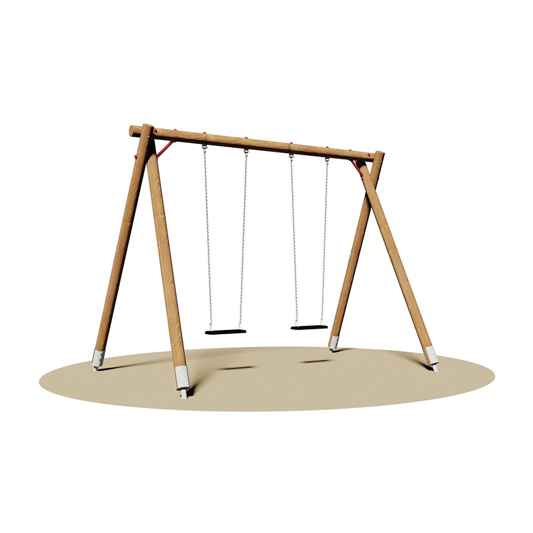 Altalena in legno 2 posti. Realizzata in legno di pino nordico impregnato in autoclave con sali atossici. Struttura costituita da una trave superiore in legno con cuore e quattro montanti obliqui in legno fuori cuore della sezione circolare Ø 120 mm. Trave e montanti sono collegati tra loro da un attacco in tubolare di acciaio zincato. Sono previsti n°2 sedili piani in gomma antiurto con anima interna in profilato di alluminio e catene a maglia stretta saldate e zincate a fuoco. Assemblaggio mediante bulloneria in acciaio zincato 8.8 e dadi autobloccanti. Attacchi in metallo zincato a caldo, per l’ancoraggio al suolo. Dimensione 365x240x275 h cm. Certificato in conformità delle Norme Europee EN 1176 dall’Istituto Tedesco TÜV - SÜD.