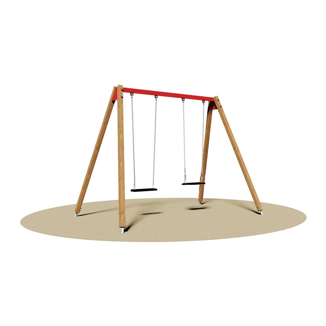 Altalena a 2 posti realizzata con struttura mista di legno lamellare di pino nordico impregnato in autoclave con sali atossici e acciaio zincato e verniciato. Costituito da n°4 montanti in legno lamellare di sez. cm 7x7, una trave in tubolare di acciaio zincato a sez. rettangolare di cm 4x8 verniciata a forno a 180°. Sono previsti n°2 sedili piani in gomma antiurto con anima interna in profilato di alluminio e catene a maglia stretta saldate e zincate a fuoco. Assemblaggio mediante bulloneria in acciaio zincato 8.8 e dadi autobloccanti. Attacchi in metallo zincato a caldo, per l’ancoraggio al suolo. Certificato in conformità delle Norme Europee EN 1176 dall’Istituto Tedesco TÜV - SÜD. Dimensione cm 300x190x230h