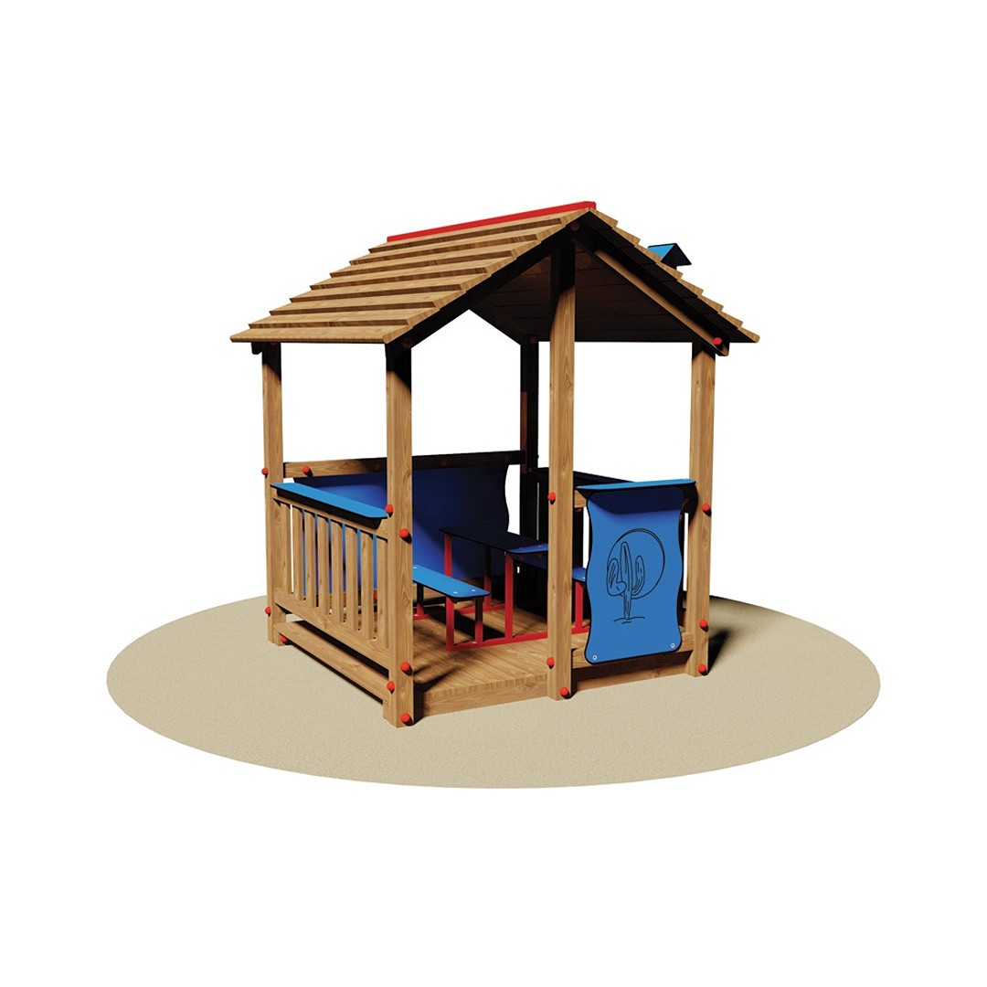 Casetta per bambini in legno realizzata in legno di pino nordico impregnato in autoclave con sali atossici. Realizzata in legno di pino nordico impregnato in autoclave con sali atossici. Struttura costituita da cinque montanti di sostegno a sez. quadra di cm 7x7 collegati alla pedana realizzata con tavole dello spessore di cm 2,5 e al tetto a falde realizzato con perlinato dello spessore di cm 2,5. I tamponamenti laterali sono costituiti da ringhierine di tavole e pannelli protettivi in bilaminato stratificato HPL dai colori vivaci. All'interno della struttura vi sono due panchette e un tavolino con telaio in tubolare di acciaio verniciato in forno a 180° e piani d’appoggio sempre in bilaminato stratificato HPL dai colori vivaci. Assemblaggio mediante bulloneria in acciaio zincato 8.8 e dadi autobloccanti. Elementi copridado a norma in nylon colorato. Certificato in conformità delle Norme Europee EN 1176 dall’Istituto Tedesco TÜV - SÜD. Dimensione 172x180x200 h