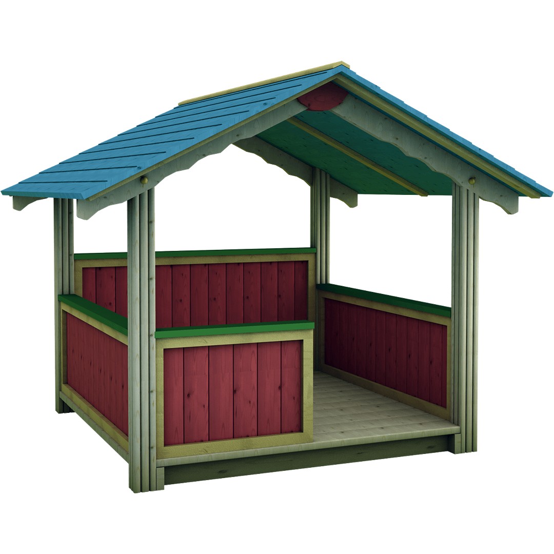 Realizzata completamente in legno di pino silvestre trattato ecologicamente per garantirne la durata negli anni. Su richiesta è possibile produrla in legno di larice. Copertura e pannelli sono verniciati con tinte atossiche dai vivaci colori e resistenti ai raggi UV. Tutta la bulloneria a vista è antisvitamento, per garantire ai vostri bambini condizioni di gioco sicure. Dimensioni 200 x 210 x h 180 cm