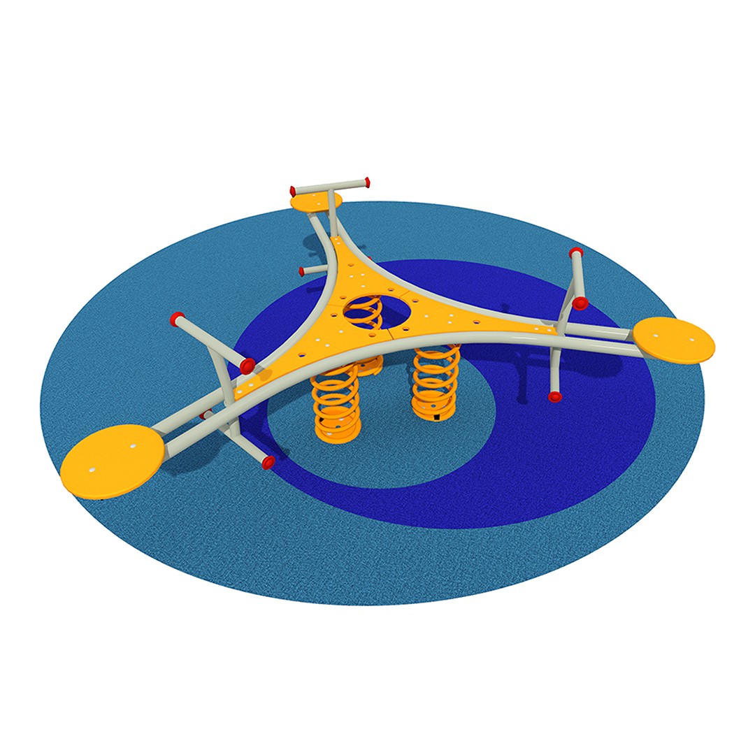 Bilico a molla realizzato in acciaio elettrozincato e verniciato a forno a 180°C. Costituito da telaio di forma triangolare in tubi di acciaio elettrozincato, sez. Ø mm 40 e lamiera sagomata in acciaio elettrozincata spess. mm 4, completo di pannellatura decorativa in polietilene PEHD, spess. mm 10, colorato pantografato e con spigoli arrotondati. Ogni vertice del dondolo è completo di dispositivo maniglia/poggiapiede in tubolare di acciaio elettrozincato, sez. Ø mm 30 e sedile in polietilene PEHD, spess. Mm 15, colorato pantografato e con spigoli arrotondati. La struttura è fissata su tre molle in acciaio verniciate a forno, omologate e complete di dispositivo antischiacciamento dita. Assemblaggio mediante bulloneria in acciaio zincato 8.8 e dadi autobloccanti. Elementi copridado a norma in nylon colorato. Certificato in conformità delle Norme Europee EN 1176 dall’Istituto Tedesco TÜV - SÜD. Dimensione cm 189x167x67h