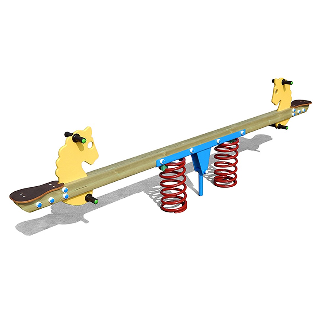 Bilico a molle a due posti. La struttura si compone di un palo lamellare in legno di pino nordico 90x90 mm, i cui angoli risultano arrotondati (r. 10 mm), che poggia su due molle. Le sedute sono realizzate in CRPY, mentre le manopole sono in polietilene. Il dondolo è arricchito con delle simpatiche sagome in HDPE colorato a forma di cavallo, per rendere il gioco più allegro e divertente. Dimensione 306x22xh80 cm