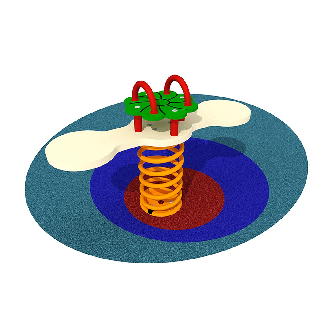 Bilico realizzato in multistrato di mogano okoumé spessore mm 40 ad incollaggio fenolico pantografato e con spigoli arrotondati. Trattamento con impregnazione colorata e finitura con vernici atossiche a base di cera diluibili ad acqua. Parte superiore costituita da pannello circolare pantografato dello stesso materiale sul quale sono fissate due maniglie in nylon colorato per ciascun posto a sedere. La struttura è fissata su molla in acciaio verniciata a forno, omologata e completa di dispositivo antischiacciamento dita. Assemblaggio mediante bulloneria in acciaio zincato 8.8 e dadi autobloccanti. Elementi copridado a norma in nylon colorato. Verniciatura a forno 180°C. Certificato in conformità delle Norme Europee EN 1176 dall’Istituto Tedesco TÜV - SÜD. Dimensione cm 90x29x56h