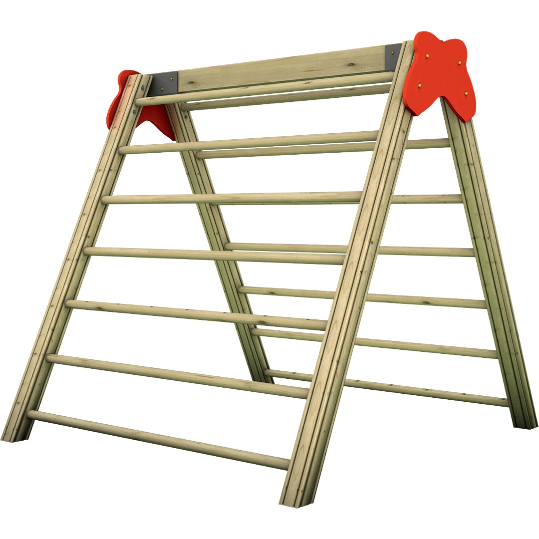 Piramide con scaletta a pioli realizzata con elementi in legno massiccio e lamellare trattati con un procedimento di impregnazione in autoclave per migliorarne la durata in caso di esposizione diretta agli agenti atmosferici.